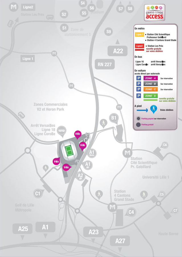 Le Stade est situé à l’intersection de plusieurs autoroutes, vous permettant ainsi de vous y rendre facilement. Quelle que soit votre provenance, suivez les indications « Grand Stade » ou « Stade Pierre-Mauroy ».
